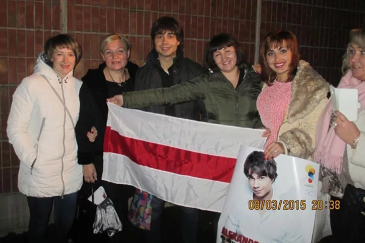 Аляксандр Рыбак сфатаграфаваўся на фоне бел-чырвона-белага сцяга з беларускамі, якія прыехалі на канцэрт у Нарвегію.