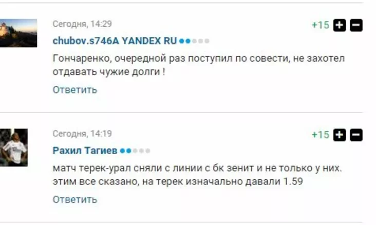 У расійскім інтэрнэце пішуць, што Ганчарэнка сышоў, каб не здаваць гульні грозненскаму «Цераку» ў наступным туры. Гэты матч называюць падазроным букмекерскія канторы. Каэфіцыент на перамогу «Церака» складае 1,4 да 1, на «Урал» — 5,4. Хоць каманды абсалютна роўныя па сіле.