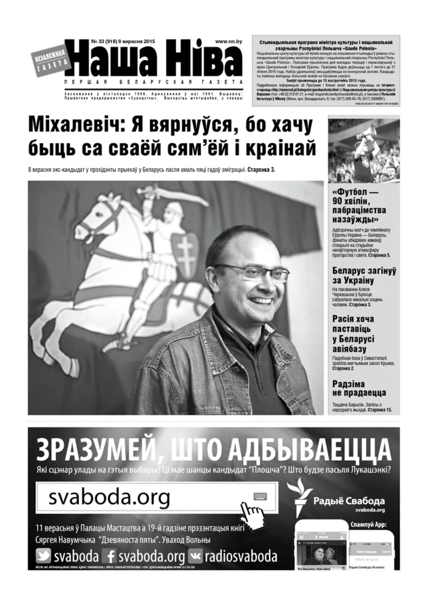Падпісаны ў друк свежы нумар (№33, 9 верасня 2015) штотыднёвіка «Наша Ніва». Падпісчыкам ён прыйдзе ўжо заўтра (у сераду), у газетных шапіках будзе з раніцы чацвярга.