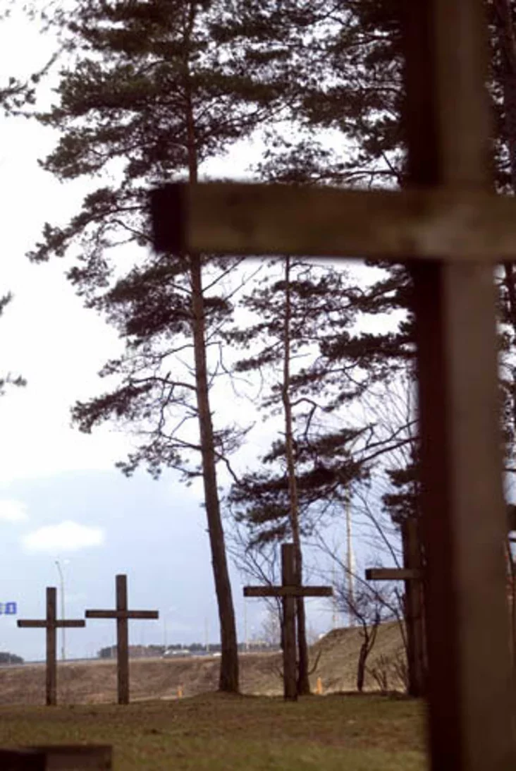 Адразу заўважна, што амаль усе крыжы паваленыя ў адзін бок. Калі меркаваць па іх накірунку, вандалы крочылі ўзбоч лесу, уздымаючыся з‑за ўзгорку да менскай кальцавой, мэтадычна ламаючы крыжы на сваім шляху. Зваляць тры — пяць прапусьцяць — зноў два‑тры зваляць. Ля аднаго з крыжоў ляжыць пустая бутэлька з‑пад піва зь неразмоклай этыкеткай. Сапраўды, цяжка ўявіць, што нехта будзе займацца такой справай на цьвярозую галаву. Ля іншага — зусім цікава: палова плястыкавай бутэлькі, запоўненая будаўнічай замазкай, зусім сьвежай, мяккай. Яе пырскі і на глебе, і на крыжы. Калі зірнуць у кірунку, адкуль, хутчэй за ўсё, прыйшлі вандалы, сапраўды пабачыш будоўлю. Аднак цяжка ўявіць сабе, што нехта будзе несьці праз гару ў лес брудную бутэльку толькі для таго, каб выкінуць яе пад крыж. Можа, вандалы наўмысна паспрабавалі заблытаць сьляды, зваліць віну на кагосьці іншага?