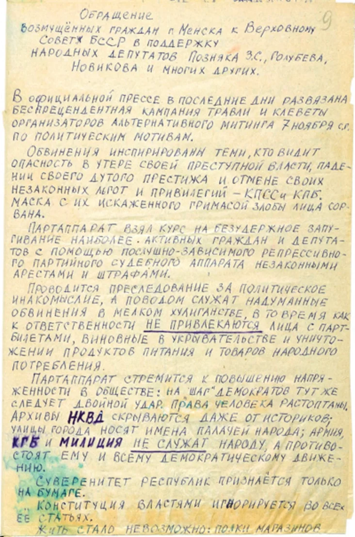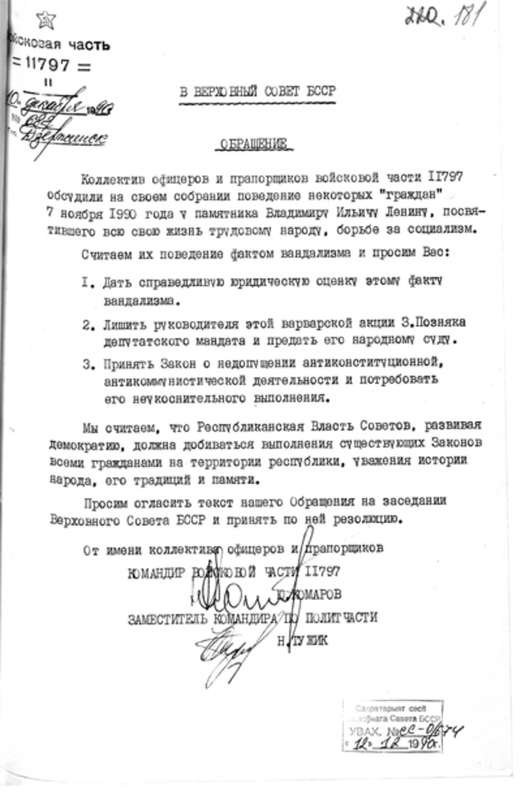 Напрыклад, у звароце рабочых і служачых Мінскага аўтамабільнага завода катэгарычна заяўлялася, што ўдзельнікі мітынгу, народныя дэпутаты Зянон Пазьняк і Валянцін Голубеў «не имеют морального права работать над проектом Основного Закона — Конституции нашей республики».