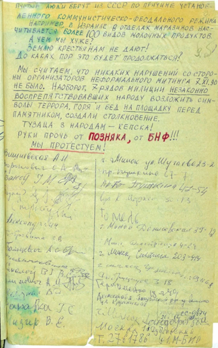 «1. Принять к сведению информацию заместителя Прокурора республики товарища Кондратьева и председателя постоянной Комиссии Верховного Совета Белорусской ССР по вопросам гласности, средств массовой информации и прав человека товарища Коротчени о нарушении общественного порядка, имевшем место 7 ноября 1990 года при проведении альтернативного митинга в городе Минске.
