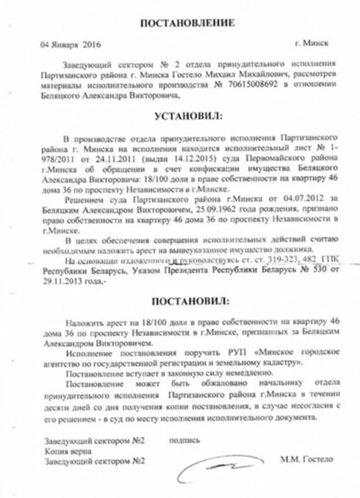 У пастанове, якая была вынесеная загадчыкам сектара № 2 М.М. Гастэлам 4 студзеня 2016 года, у прыватнасці ўказана, што ў вытворчасці аддзела прымусовага выканання Партызанскага раёна г.Мінска на выкананні знаходзіцца выканаўчы ліст № 1-978/2011 ад 24.11.2011 суда Першамайскага раёна г. Мінска аб накіраванні ў кошт канфіскацыі маёмасці Алеся Бяляцкага 18/100 долі ў праве ўласнасці на кватэру, у якой ён стала пражывае са сваёй сям’ёй. У мэтах забеспячэння ажыццяўлення выканаўчых дзеянняў на дадзеную маёмасць накладзены арышт.