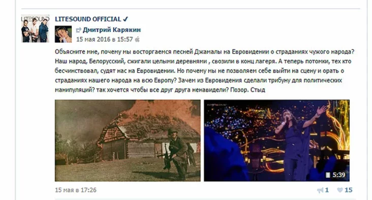 Саліст беларускага гурту Litesound Дзмітрый Каракін вельмі жорстка пракаментаваў перамогу ўкраінкі Джамалы на конкурсе «Еўрабачанне-2016» ў Стакгольме:
