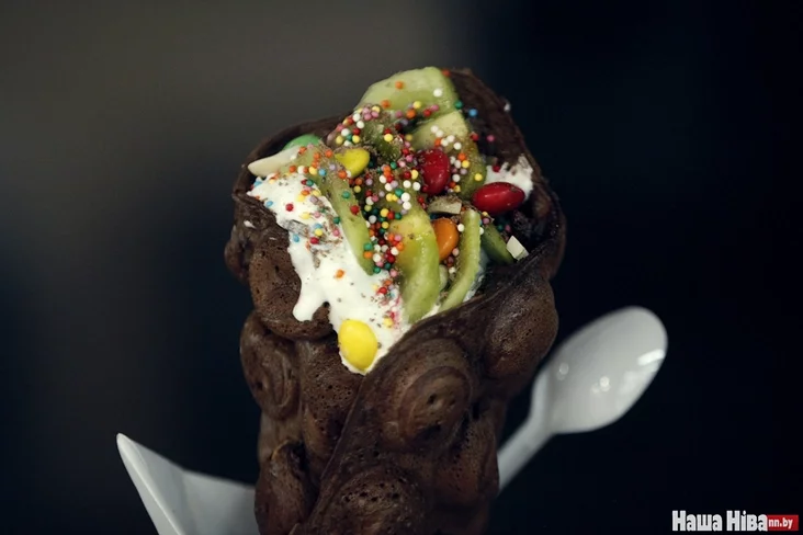 Мы замовілі дзве вафлі: з вяршкамі і марозівам, з рознымі інгрэдыентамі. Хлопец Сяргей даволі хутка ўправіўся з замовай і быў вельмі ветлівым. На самім фуд-пункце ўсё вельмі чыста: перад гатаваннем кожнай новай замовы Сяргей мяняў пальчаткі.