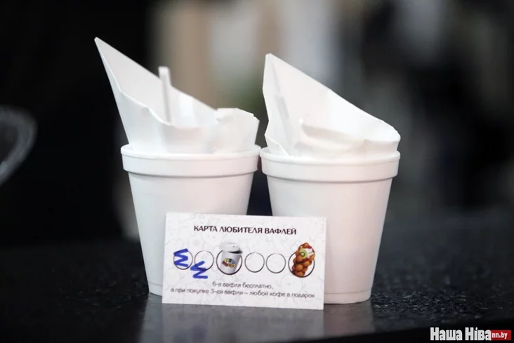 Поўны камплект абыйдзецца ў 60 тысяч. Акрамя вафляў, там можна набыць каву і малочны кактэйль: цэны вагаюцца ад 18 да 38 тысяч.