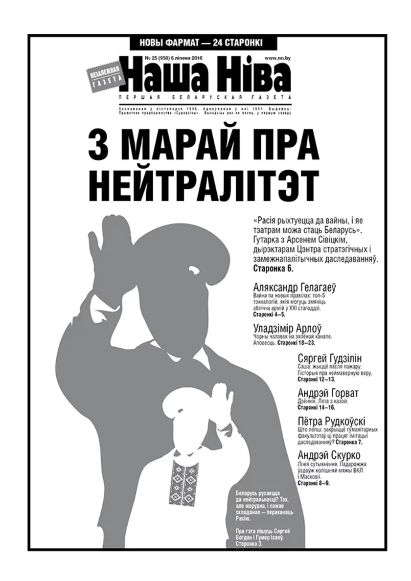 Памятайце, што Наша Ніва / NN.BY — незалежная газета. Яна існуе на ахвяраванні і грошы з продажаў. Таму яна адлюстроўвае інтарэсы беларускага грамадства, а не дзяржавы. Наша Ніва была заснаваная ў 1906, адноўленая ў 1991. Ахвяраваць грошы на НН можна ў любым банку, а таксама праз АРІП. Дзякуй за падтрымку!