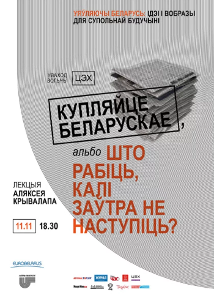 11 лістапада 2016 г. Лятучы ўніверсітэт і Міжнародны кансорцыум «ЕўраБеларусь» у межах цыкла «Уяўляючы Беларусь: ідэі і вобразы для супольнай будучыні» запрашаюць на адкрытую лекцыю культуролага Аляксея Крывалапа «Купляйце беларускае», альбо Што рабіць, калі заўтра не наступіць?». Лекцыя будзе праходзіць у крэатыўнай прасторы «ЦЭХ» (вул. Кастрычніцкая, 16), пачатак а 18.30. Уваход вольны!