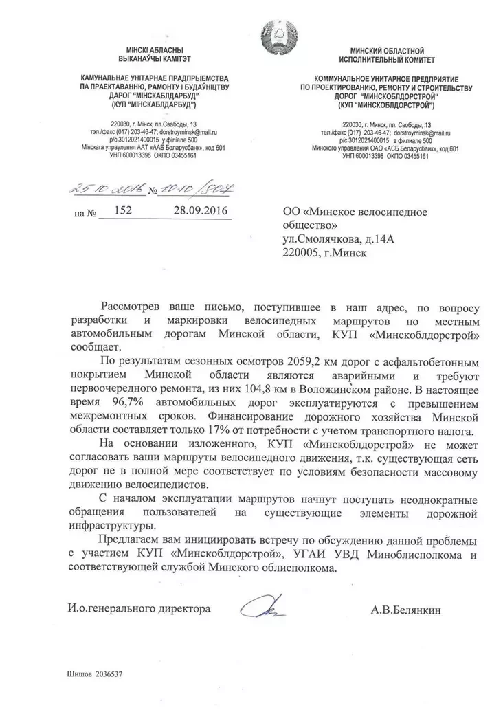У канцы кастрычніка яно даслала адказ на ліст Мінскага веласіпеднага таварыства (яго змясціў у Facebook чалец таварыства Яўген Харужы). Раварыстаў цікавіла пытанне распрацоўкі і маркіроўкі веласіпедных маршрутаў па мясцовых аўтадарогах Мінскай вобласці.