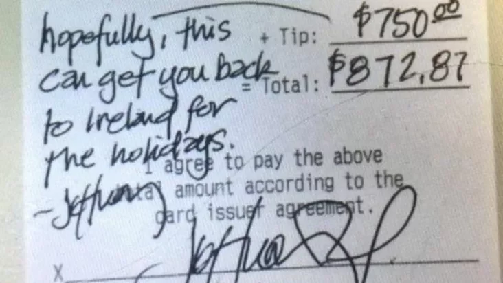 Афіцыянт тэхаскага рэстарана атрымаў ад кліента чаявыя на суму 750 даляраў пасля таго як згадаў, што два гады не бачыў сваю сям'ю з Паўночнай Ірландыі, піша ВВС.