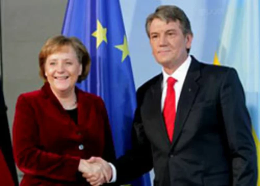 Віктар Юшчанка на пачатку сустрэчы з Ангелаю Мэркель з вока на вока выказаў надзею, што ў рамках візыту канцлера ва Ўкраіну будзе распачаты новы этап адносін двух краін