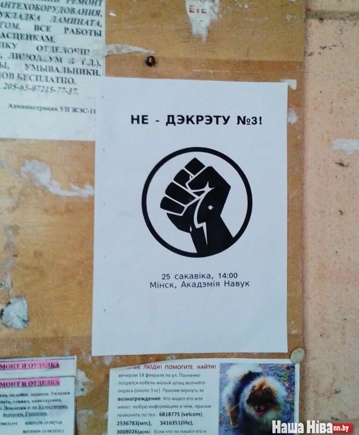 На дошках аб'яў у мінскіх пад'ездах пачалі з'яўляцца заклікі да ўдзелу ў акцыі на Дзень Волі 25 сакавіка. Адной з мэт сёлетняй акцыі будзе пратэст супраць Дэкрэта №3, вядомага як «дэкрэт аб дармаедах».