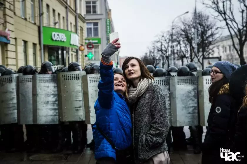 Для Любові Дзядзінкінай 25 сакавіка — сапраўднае нацыянальнае свята, якое не мусіць быць забытым і якое трэба святкаваць усім народам на вуліцах Беларусі. Яе ўсмешлівае сэлфі з сяброўкай на фоне шэрагу шчытавікоў, якія перакрывалі праспект Незалежнасці падчас разгону вулічнай акцыі, імгненна разляцелася па СМІ і сацыяльных сетках. У каментарыях выказваліся кампліменты дзяўчынамі, а некаторыя нават назвалі гэтае фота сімвалам мірных пратэстаў Беларусі. Еўрарадыё знайшло аўтарку знакамітага сэлфі і пагутарыла з ёй. Як высветлілася, Любоў працуе дзіцячым трэнерам па каратэ. Яна вельмі пазітыўная і далікатная дзяўчына з неверагодна прыцягальнай усмешкай і актыўнай жыццёвай пазіцыяй.