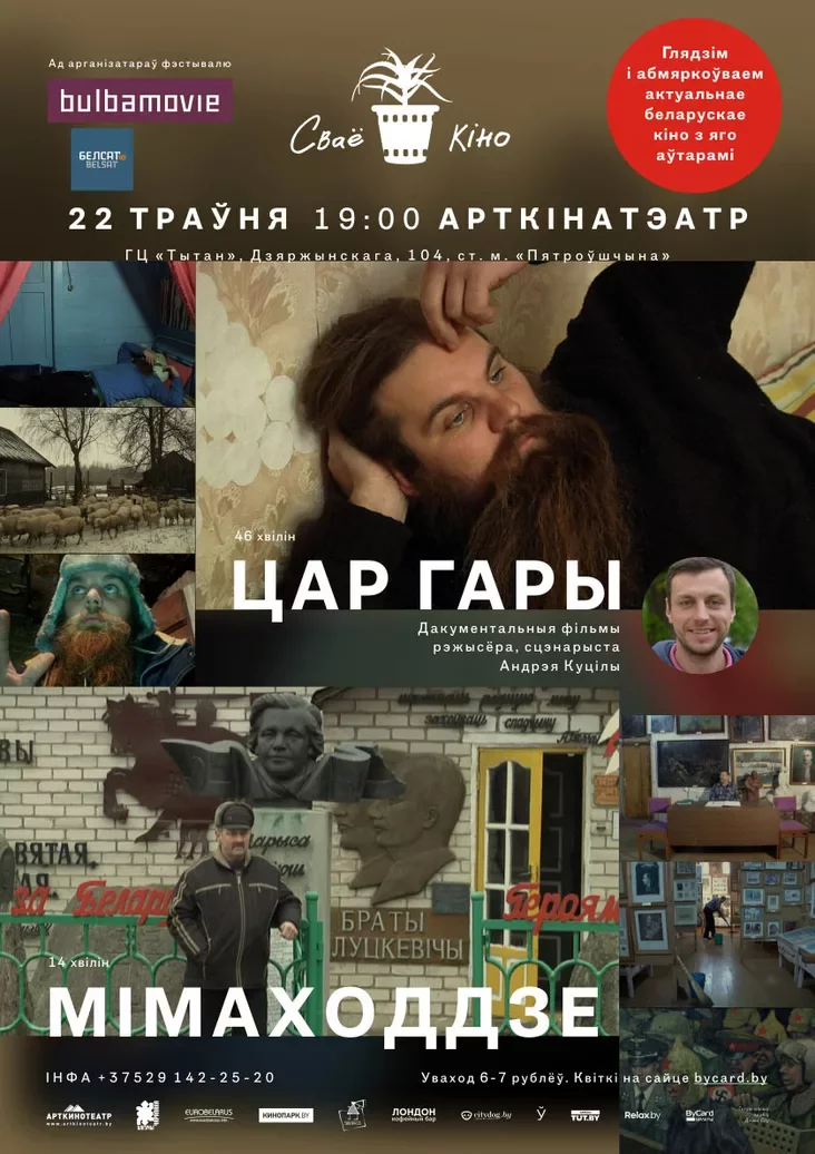 22 МАЯ ў мiнскiм «АРТ-кiнaтэатры» (пр-т Дзяржынскага,104, ст.м. «Пятроўшчына») у рамках праекта «СВАЁ КІНО: любім і глядзім» разам з БЕЛСАТ TV адбудзецца аўтарскі вечар вядомага беларускага рэжысёра-дакументаліста Андрэя Куцілы. Будуць прадстаўленыя фільмы «Цар гары» (2017) і «Мімаходдзе» (2016).
