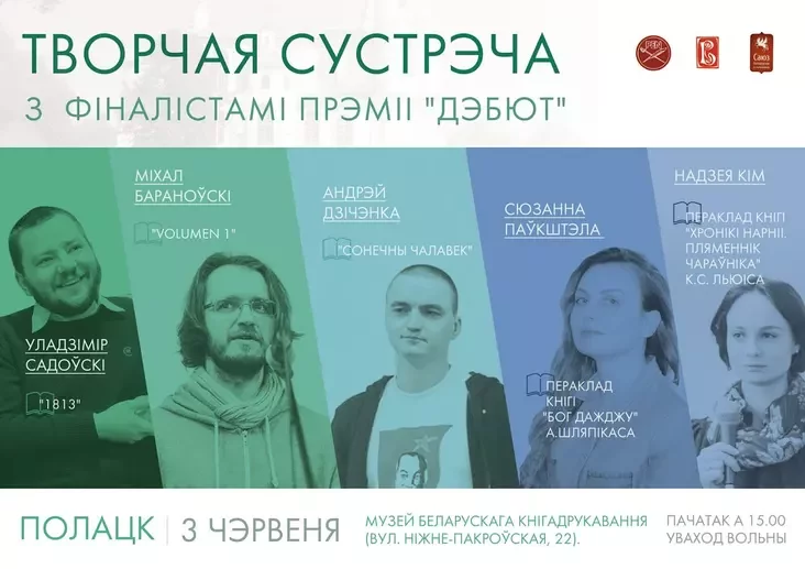Полацк наведаюць адразу пяцёра сёлетніх фіналістаў прэміі «Дэбют» імя Максіма Багдановіча — Сюзанна Паўкштэла, Уладзімір Садоўскі, Надзея Кім, Андрэй Дзічэнка і Міхал Бараноўскі.