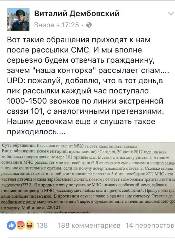 «Першыя гадзіны пасля рассылкі тэлефонныя лініі сталічнага МНС былі перагружаныя пустымі званкамі наконт тых СМС, — распавёў «Нашай Ніве» Віталь Дэмбоўскі, намеснік начальніка мінскага гарадскога ўпраўлення МНС. — Людзі сапраўды званілі, каб задаць пытанне ці выказаць абурэнне. Але калі чалавек атрымлівае смс з папярэджаннем пра надвор’е, то не трэба званіць у МНС, каб падзяліцца сваім меркаваннем. Нумар 101 існуе выключна для экстраннага паведамлення аб надзвычайнай сітуацыі альбо пагрозе жыццю і здароўю людзей; у той момант, калі лініі перагружаныя званкамі на староннія тэмы, камусьці можа спатрэбіцца рэальная дапамога, і ён папросту не зможа аператыўна датэлефанавацца. Просьба ўлічваць гэты фактар і не тэлефанаваць проста так. Каб удакладніць любыя пытанні датычна дзейнасці Міністэрства, існуе закон аб зваротах грамадзян, у адпаведнасці з якім можна звярнуцца пісьмова альбо праз электронную форму на нашым сайце».