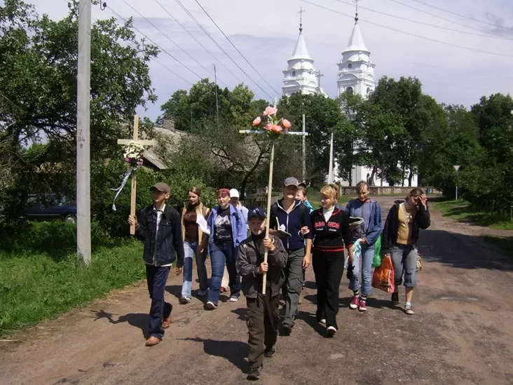 Нас было каля дзесяці чалавек. Падлеткі, моладзь. Па чарзе неслі два драўляныя, упрыгожаныя кветкамі крыжы. Спявалі песні, маліліся. Прыйшлі ў Будслаў якраз да «пілігрымскай» Імшы а 18-й гадзіне.