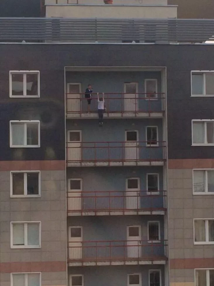 У нядзелю ў вайбер-чаце чатырох дамоў на вуліцах Багдановіча і Тургенева ў Мінску з'явілася наступная фатаграфія. На здымку двое хлопцаў: адзін павіс на парэнчах балкона, іншы яго фатаграфуе. Усё гэта адбывалася на 26-м паверсе, піша Tut.by.
