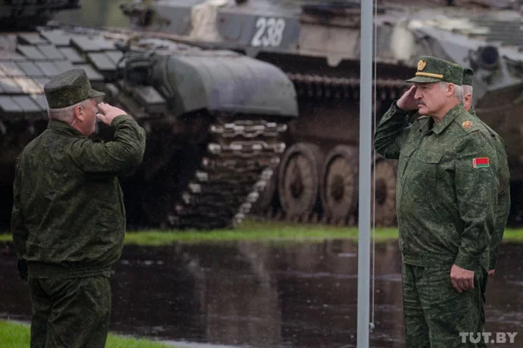 Аляксандр Лукашэнка глядзіць з назіральнай пляцоўкі за ходам сумесных вучэнняў Беларусі і Расіі «Захад-2017» на 227-м агульнавайсковым палігоне Барысаўскі, паведамляе БелТА.