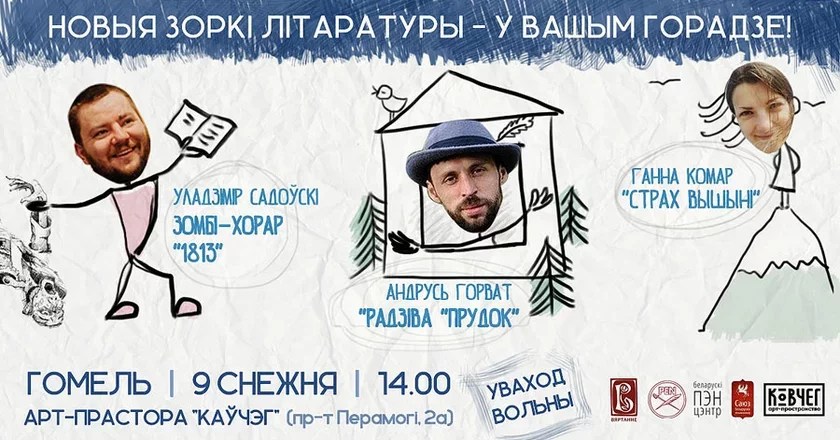 Комар дэбютавала з кнігай вершаў «Страх вышыні», за якую ўжо паспела атрымаць таксама ўзнагароду ў Швецыі. Садоўскі — аўтар зомбі-хорару «1813»: навелу называюць першай у гэтым жанры па-беларуску. Горват жа стаў літаратурным адкрыццём мінулага года за кнігу «Радзіва «Прудок». Дзённік». Каб атрымаць ад аўтара аўтограф, чытачы выстройваліся ў чэргі на вуліцы. Але па-за Мінскам кніга Горвата так і не была прадстаўлена. Сустрэча ў Гомелі — рэдкі выпадак пагаварыць з пісьменнікамі ўжывую.
