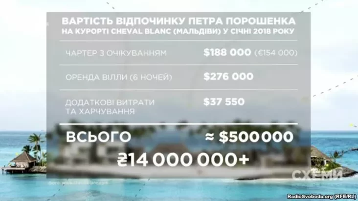 Усяго, па падліках журналістаў, Парашэнка выдаткаваў на калядны адпачынак на Мальдыўскіх выспах не менш за 500 000 даляраў.
