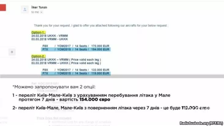«Схемы» накіравалі ліст авіякампаніі і спыталі пра кошт пералёту на Falcon 7X. Згодна з прадстаўленай інфармацыяй, журналісты выказалі здагадку, што арэнда борта з прастоем на працягу амаль усяго перыяду адпачынку каштавала прэзідэнту прыкладна ў 154 000 еўра.