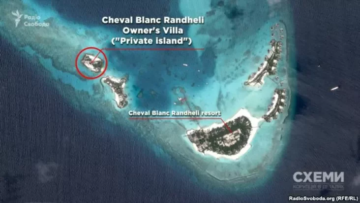 «З аэрапорта Мале, куды прэзідэнт і яго госці прыляцелі чартарам, яны дабраліся да астраўнога курорта. 8 дарослых і 2 дзяцей пасяліліся на самай дарагой віле курорта, які размешчаны на асобнай выспе», — гаворыцца ў расследаванні.