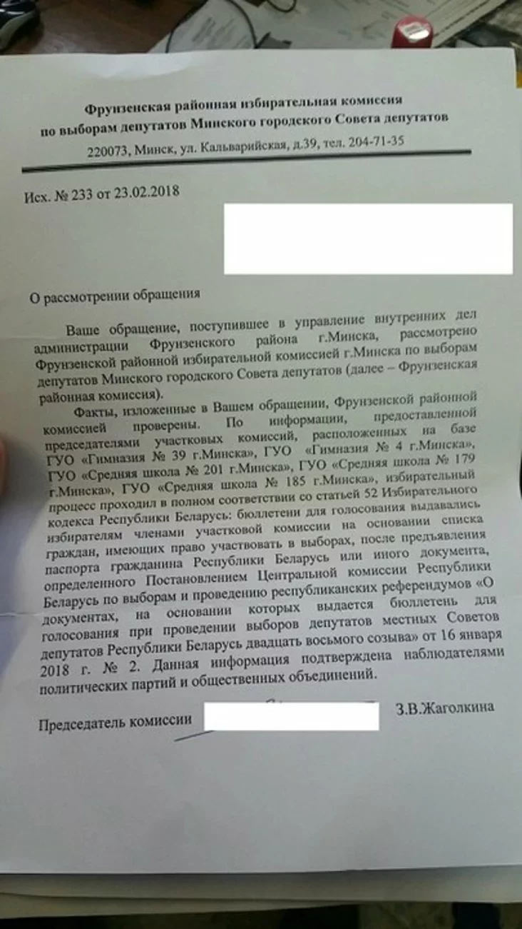 На думку старшыні камісіі Зінаіды Жаголкінай, выбарчы працэс на ўсіх названых участках праходзіў «у поўнай адпаведнасці з артыкулам 52 Выбарчага кодэкса: бюлетэні выдаваліся на падставе спісу грамадзян, якія маюць права ўдзельнічаць у выбарах, пасля прад'яўлення пашпарта ці іншага дакумента».