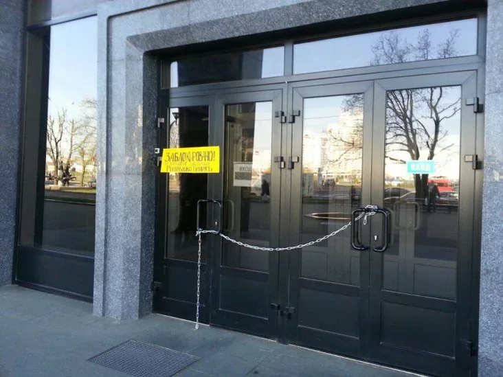 Падчас абедзеннага перапынку чыноўнікаў яны павесілі на дзверы ланцуг з замком і плакат «Заблакаваны за парушэнне Канстытуцыі».