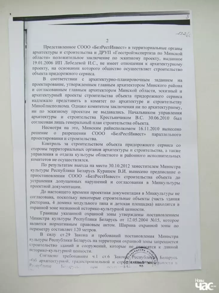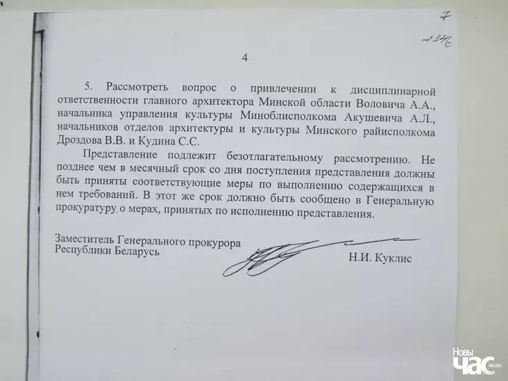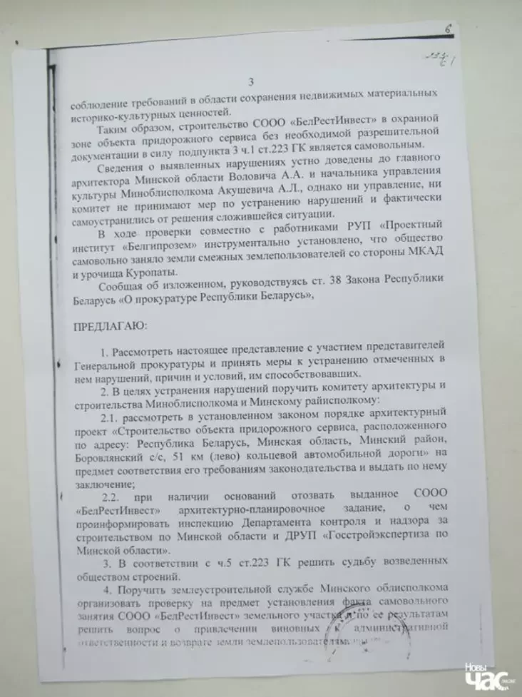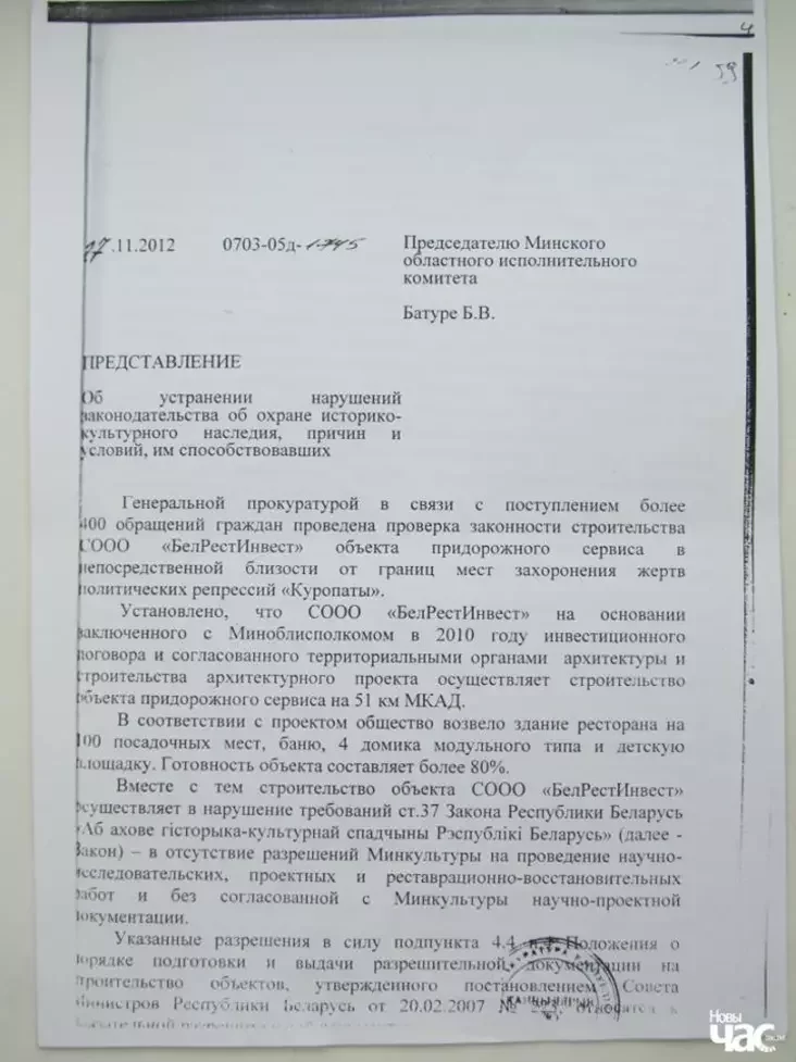 Газета «Новы час» апублікавала прадстаўленне, якое Генеральная пракуратура выносіла старшыні Мінаблвыканкама Барысу Батуру ў 2012 годзе.