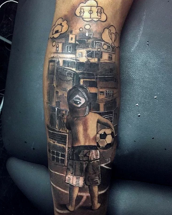 На адной з лытак размешчаная карцінка маленькага хлопчыка, які басанож гуляе ў футбол у бразільскіх фавэлах. Алюзія на самога Нэймара чытаецца вельмі-вельмі лёгка. Мабыць, туды ж у дзяцінства адсылае тату на перадплеччы на Нэймара, дзе размяшчаецца кулак і надпіс кажа: «Гэта частка маёй гісторыі». Лёгкім жыццё ў форварда не было ніколі.
