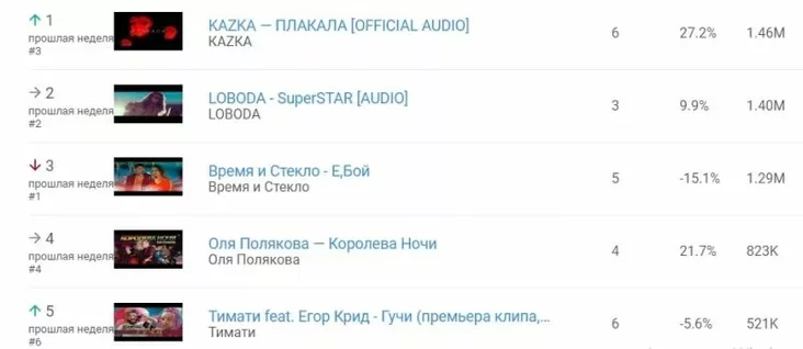 Чарт кліпаў ва ўкраінскім сегменце YouTubе узначаліў гурт Kazka з песняй Плакала. Гэта — першая ўкраінскамоўная кампазіцыя, якая трапіла ў топ украінскага чарта YouTube, паведамляе karabas.live.