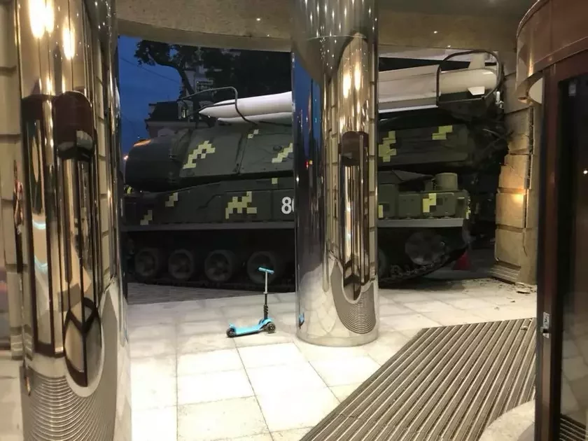 У Кіеве на Падоле зенітная ўстаноўка «Бук» урэзалася ў сцяну бізнэс-цэнтра «Астарта», паведамляе 112.ua.