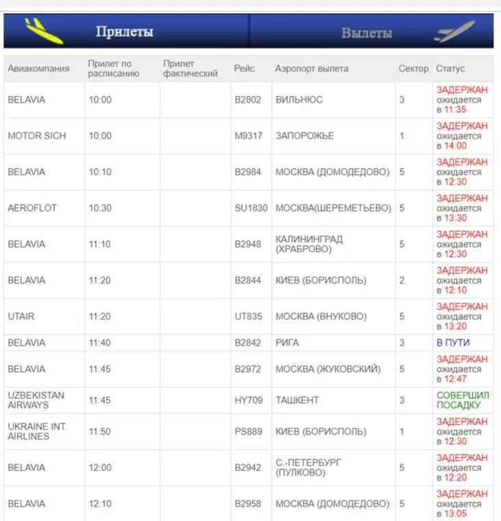 На дадзены момант затрымліваюцца чатыры самалёты з Масквы (рэйсы В2984, SU1830, UT835 і В2972), а таксама авіярэйсы з Вільні (В2802), Запарожжа (М9317), Калінінграда (В2948), Кіева (В2844 і PS889), Стамбула (В2784) і Санкт-Пецярбурга (В2942). Час затрымкі складае ад 20 хвілін да 4 гадзін.