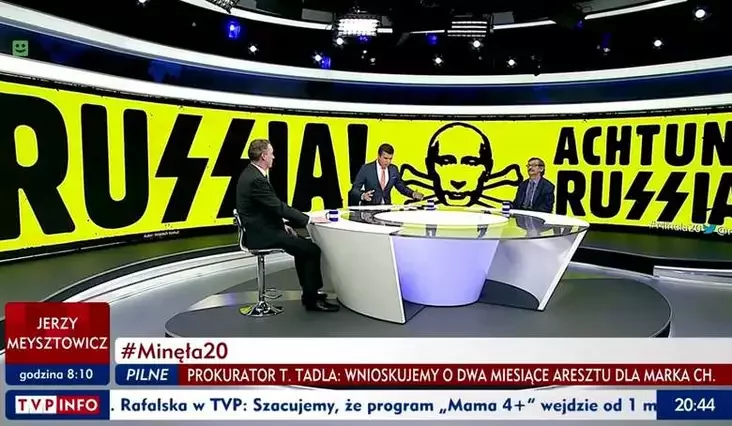 Польскі тэлеканал TVP Info прадэманстраваў партрэт прэзідэнта Расіі Уладзіміра Пуціна, стылізаваны пад лагатып пестыцыду «Цыклон Б». Выяву Пуціна дапаўняла слова «Расія», змененае пад эмблему СС падчас ток-шоу Minęła 20, паведамляе ZET.