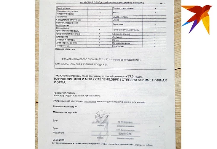 — На адным з планавых УГД, на 33-м тыдні цяжарнасці, лекар сказаў, што ў дзіцяці не апаражняецца мачавы пузыр. Адправілі ў Гомельскую абласную бальніцу. Там УГД паказала, што ў дзіцяці непрапарцыйная галава і тулава, але сказалі, што пры правільным лячэнні сітуацыю можна паправіць, прызначылі карэкціровачнае лячэнне. У дыягназе фігуравалі «затрымка ўнутрычэраўнага развіцця плода, парушэнні ў сістэме маці-плацэнта-плод, калі дзіця недаатрымлівае пажыўныя рэчывы і кісларод, парушэнне маткава-плацэнтарнага кровазвароту. Вярнулася ў Жлобін, праляжала амаль два тыдні ў бальніцы і выйшла ўжо без дыягназу ФПК. Праз два дні на аглядзе ў жаночай кансультацыі лекар сказала, што ў мяне тонус маткі, і зноў адправіла ў бальніцу. 21 верасня чарговае КТГ выдала вынік: праверце сэрцабіццё дзіцяці. Лекары замітусіліся і вырашылі тэрмінова рабіць кесарава сячэнне. Маё дзіця нарадзілася на 38-м тыдні. А калі мне яго прынеслі…