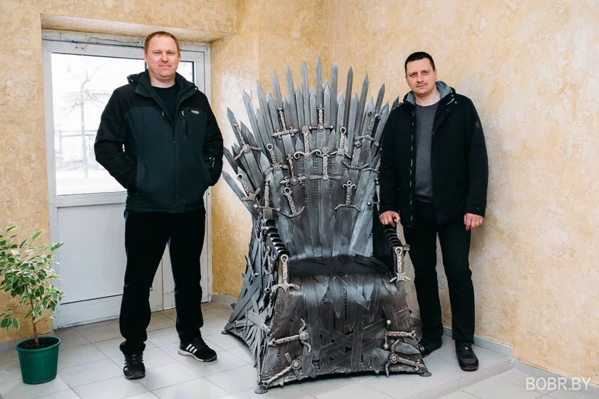 Жалезны трон выкавалі майстры Аляксандр Разбягаеў і Юрый Кірычэнка. На яго стварэнне пайшло тры месяцы і больш за 50 мячоў, — распавядае Раман Лукашэвіч, намеснік галоўнага інжынера фабрыкі. — У нашым калектыве нямала прыхільнікаў серыяла «Гульня тронаў», а ўзнавіць трон прыдумаў дырэктар, Андрэй Дубінчык.