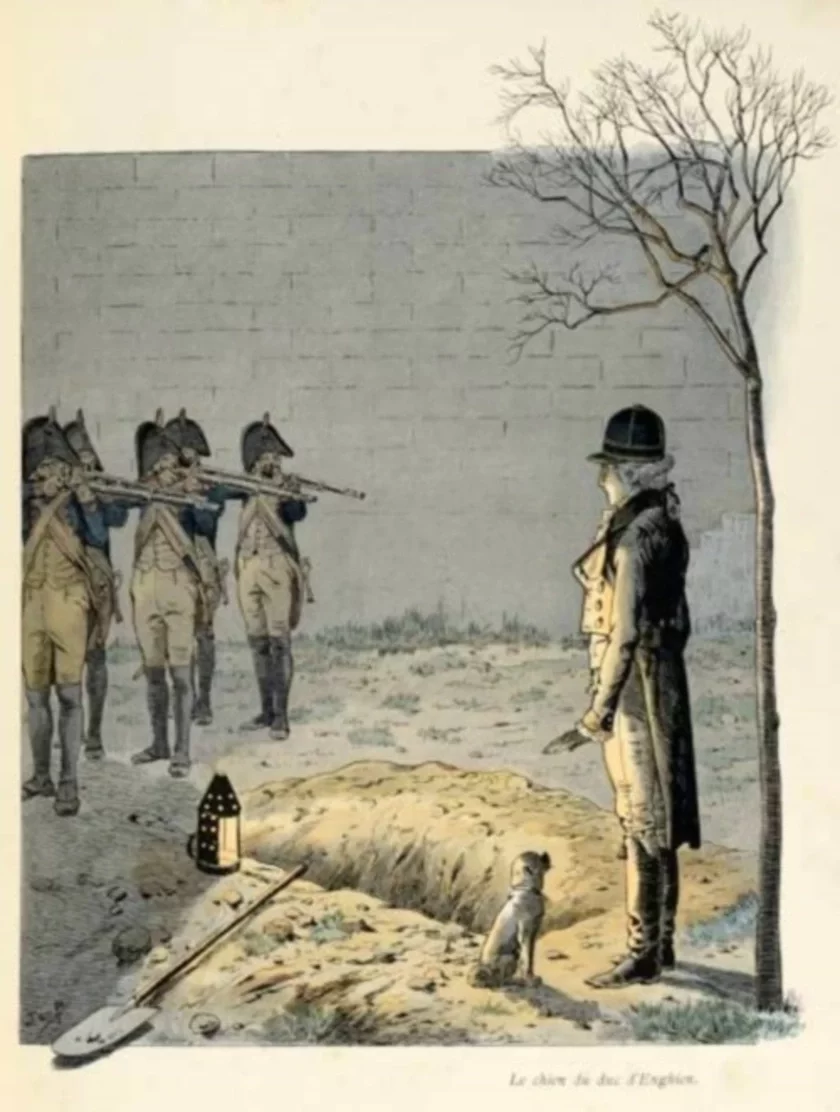 Але адразу пасля суда, ноччу, Антуана Энгіенскага, Бурбона, вывелі пад сцены Венсэнскага замка на расстрэл. Побач, перад падрыхтаванай магілай, сядзеў верны пудзель Магілёў. Салдатам было нязручна цэліць у цемры, то герцага папрасілі трымаць у руцэ запалены ліхтар. «Дзякуй Богу, — сказаў пры канцы жыцця герцаг, — я паміраю як воін». І сам скамандаваў салдатам: «Плі!»