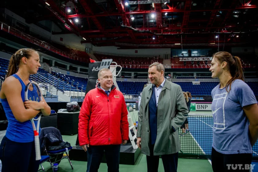 Вера Лапко стаіць насупраць Арыны Сабаленка ў кампаніі былых міністра спорту і турызму Аляксандра Шамко і кіраўніка федэрацыі тэніса Аляксандра Шакуціна. Фота: Дар'я Буракіна, TUT.BY