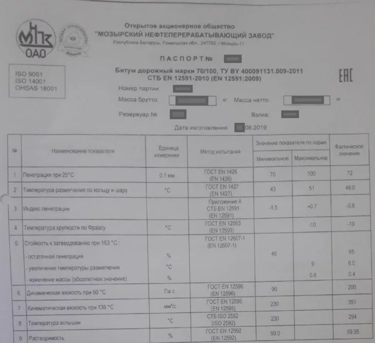 Сэнс атрыманай намі інфармацыі ў тым, што пры замове з Мазыра бітуму маркі «70/100» (у назве маркі другой лічбай адразу і пазначаецца пенетрацыя) прыйшло невядома што.