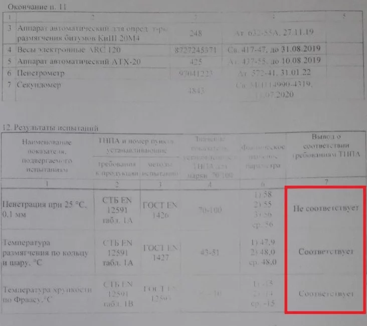 Маўляў, бітум быў кепскі і візуальна, і па паху. Таму было вырашана адправіць яго на экспертызу ў адзін з дзяржаўных інстытутаў. Адказ пацвердзіў падазрэнні — па асноўнай характарыстыцы якасць бітуму была далёкай ад дэклараванай.