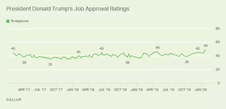 Паводле апытання Gallup, рэйтынг прэзідэнта ЗША Дональда Трампа дасягнуў 49%, што з'яўляецца максімальнай ацэнкай адабрэння дзейнасці прэзідэнта з моманту інаўгурацыі.