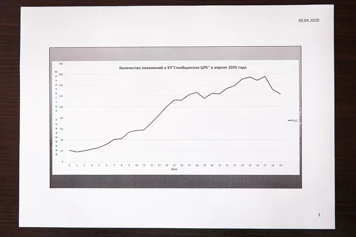 Графік колькасці пацыентаў з пнеўманіямі ў бальніцы Стоўбцаў. Яна мае 159 ложкаў, і ў канцы красавіка пнеўманійнікі занялі іх цалкам. Вялікую частку іх, а таксама людзей з іншымі хваробамі сталі адпраўляць у іншыя гарады.