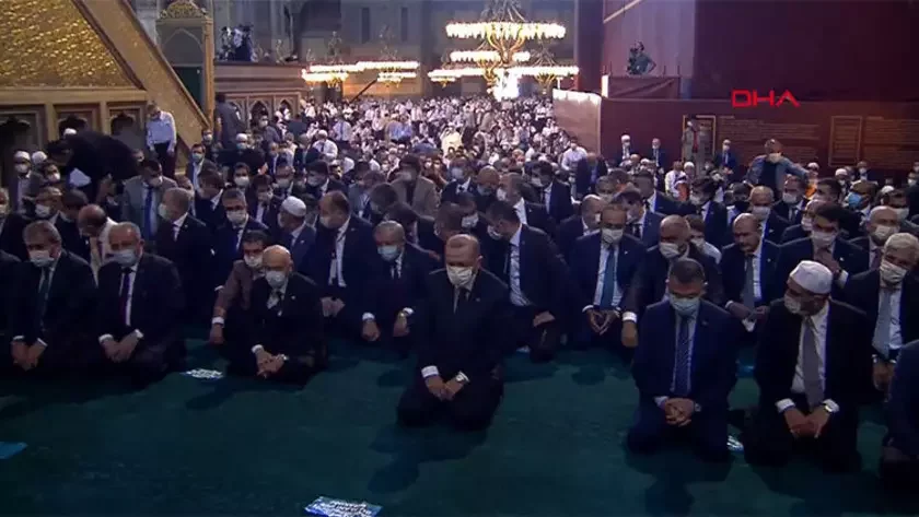 Адзначаецца, што заклік да малітвы, які раздаецца з мінарэтаў, чытае прэзідэнт Турцыі Рэджэп Таіп Эрдаган. Усім вернікам раздалі ваду і тэкст указа султана Мехмеда Фаціха. У ім гаворыцца аб перадачы святыні мусульманаў да Суднага дня. Паведамляецца, што старадаўнія хрысціянскія фрэскі былі схаваныя.
