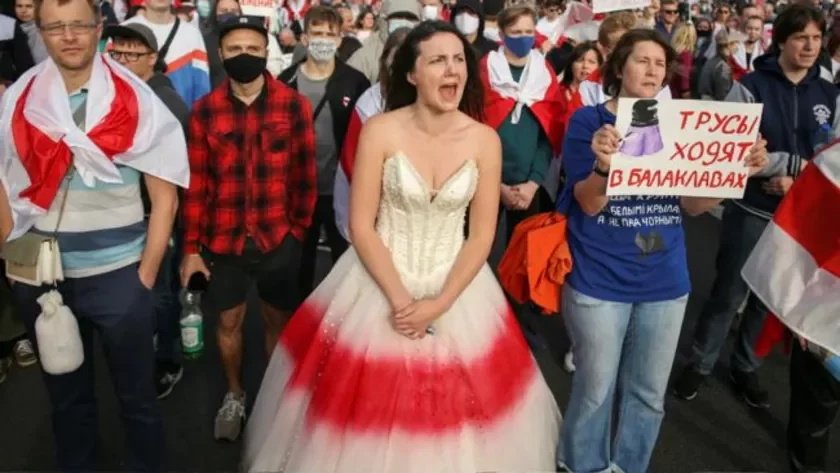 Іна Зайцава — прыгажуня, якая з'яўляецца на суботніх і нядзельных мірных акцыях пратэсту ў белай вясельнай сукенцы з намаляванай на ёй чырвонай паласой, піша Радыё Свабода.