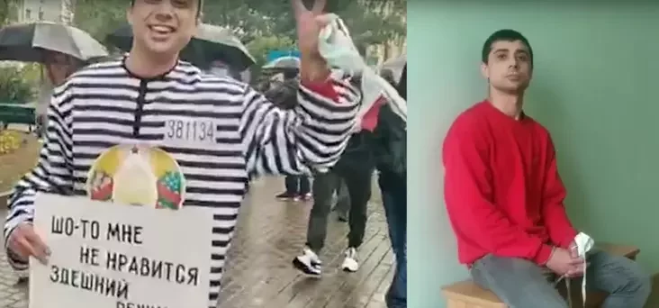Малады чалавек з плакатам быў апрануты ў паласатую вопратку, стылізаваную ў «турэмную робу». Неўзабаве яго затрымалі.