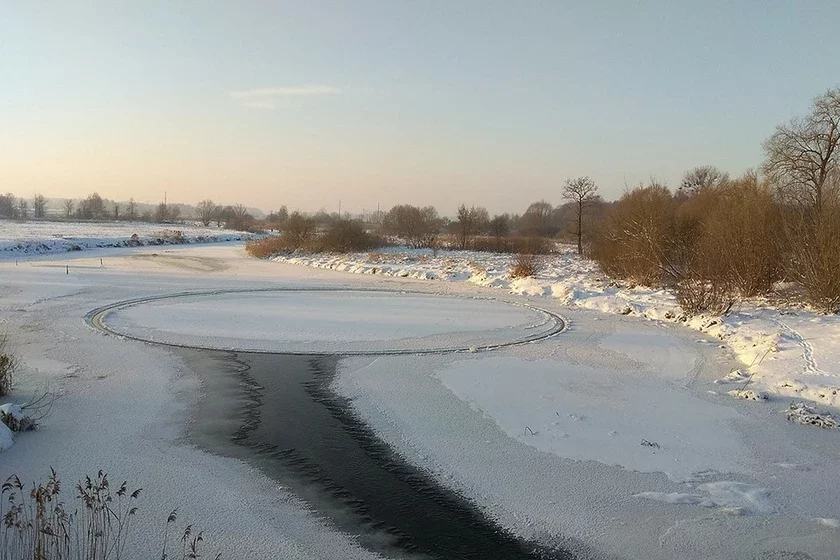 — У Камянцы ёсць мост праз раку Лясная. У гэтым месцы атрымліваецца такое як бы бутэлькавае рыльца: рака праходзіць пад мостам, потым рэзка пашыраецца, утворыцца невялікі вір. Нядаўна рэзка прыйшоў моцны мароз, на рацэ стаў лёд. Буйныя крыгі трапілі ў вір, іх закруціла, маса лёду стала нарошчвацца — і ўтварылася кола. У дыяметры каля 25-27 метраў, — распавядае Андрэй Асташэня.