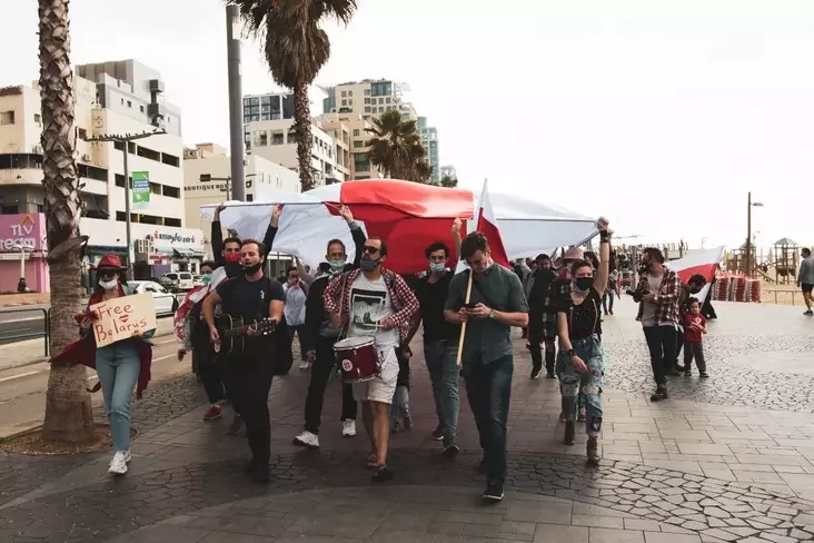 На набярэжнай Тэль-Авіва сабраліся 50 чалавек, каб прыняць удзел у музычным шэсці з велізарным нацыянальным сцягам Беларусі. Яго арганізаваў рух «Ізраіль за свабодную Беларусь».