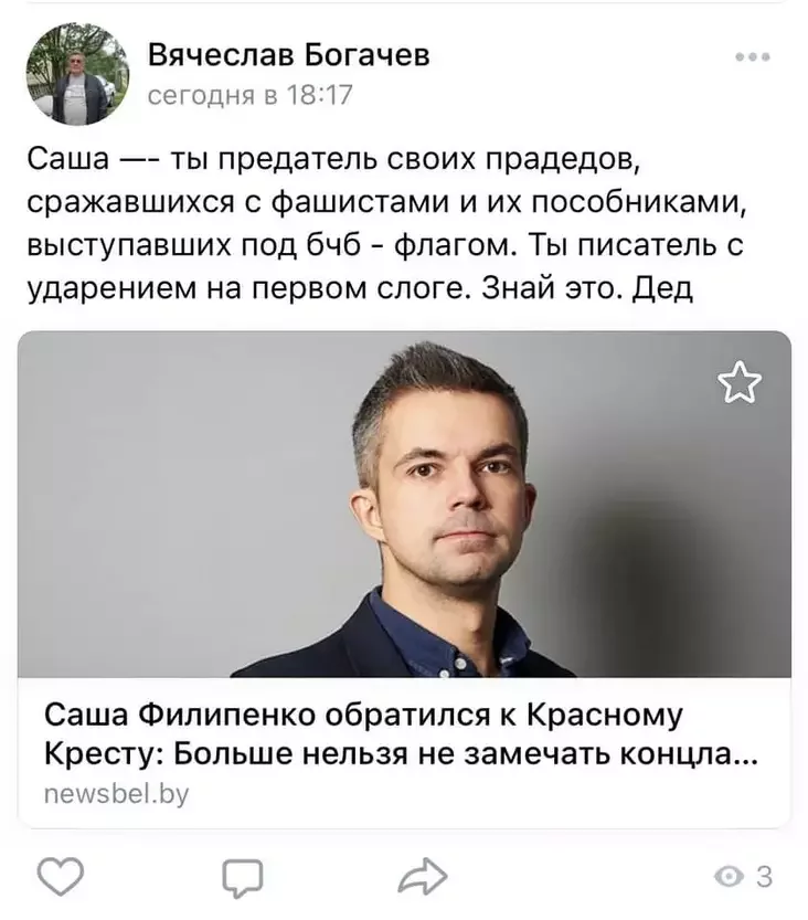 Пісьменнік Саша Філіпенка, вядомы сваёй актыўнай грамадзянскай пазіцыяй і крытыкай дыктатуры ў краіне, распавёў пра пацешны выпадак. Праз 36 гадоў аб'явіўся дзядуля пісьменніка. У сацыяльных сетках ён аблаяў унука.
