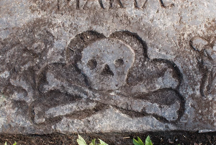 Калі хрысціянская сімволіка на надгробках застаецца пашыранай і ў наш час, то сімвалы, звязаныя з самім фактам смерці, амаль цалкам зніклі з ужытку. Сёння нам складана ўявіць, каб нехта замовіў свайму памерламу сваяку надмагілле з выявай чэрапа і скрыжаваных костак, але на гістарычных могілках Беларусі мы можам знайсці сотні помнікаў з такімі знакамі. Такая выява знаходзіцца ў ніжняй частцы помніка і называецца галавой Адама. Над ёю заўжды знак крыжа — як ахвяры, якую прынёс Хрыстос, адкупіўшы ёю першародны грэх чалавека.